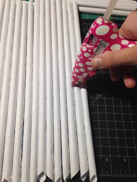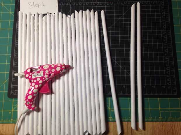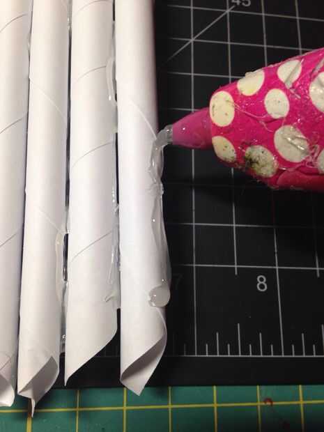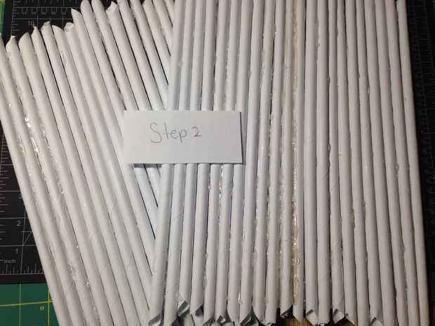 Caliente, pegamento 23 tubos de papel para crear un panel. Para ello, comience con un tubo y Aplique pegamento caliente por un lado. Tomar otro tubo y pegar al primer tubo, manteniendo el par juntos por unos momentos crear un lazo apretado. Repita este proceso hasta que todos los 23 tubos se pegan en un panel plano.