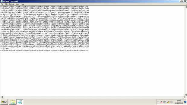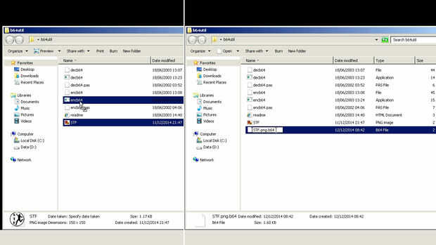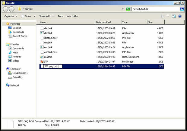 Copie el archivo a la carpeta del programa "Base64". Mi archivo era "STF.png" arrastre encima del archivo "encb64.exe". Codificador de Bas64 creará un nuevo archivo llamado "nombre. OriginalFileExtension.b64", por lo que en mi caso"STF.png.b64"recién creado archivo, contiene una gran cantidad de símbolos. Cambie la extensión de los archivos a "txt", en mi caso "STF.png.txt".