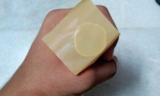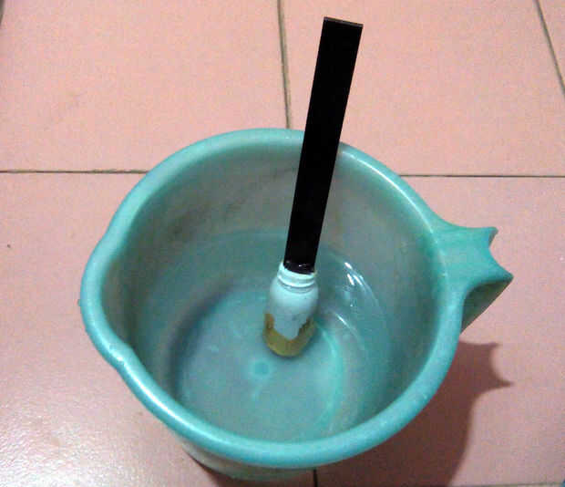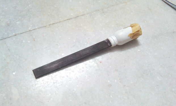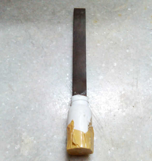 Después se corta la parte inferior y el archivo está bien comenzar a añadir pegamento caliente de la parte inferior. Puede Agregar cinta en la región del cuello para que el pegamento que no se escape hacia fuera. Después de rellena completamente el molde (fevicol botella) Añadir una cinta marrón en su parte inferior y siga recto por una superficie.