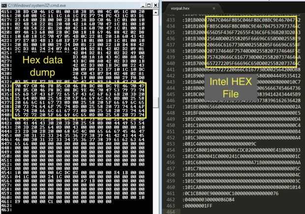 • 33: pasamos read_line_from_hex() nuestras variables que queremos llenar. El archivo hex que queremos analizar (archivo), el tampón que mantenga los datos de la línea en la matriz de int que servirá para contener la dirección de esta línea de datos, una variable que contenga el número de bytes en esta línea. Si la función se obtuvo datos, devolverá true. En caso contrario, devolverá false. Almacenamos esta bandera para asegurarse de que tenemos algo.
