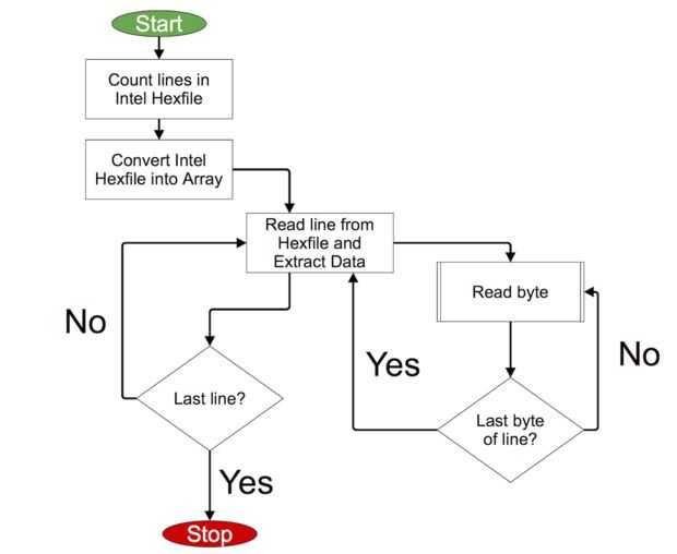 Para cargar datos desde un archivo de formato Intel HEX utilicé varias funciones, open_file() para crear un flujo de datos, más comúnmente conocido como un apuntador de archivo, del archivo que quería leer. Y hex_file_to_array(), para analizar el archivo hexadecimal y extraer los datos.