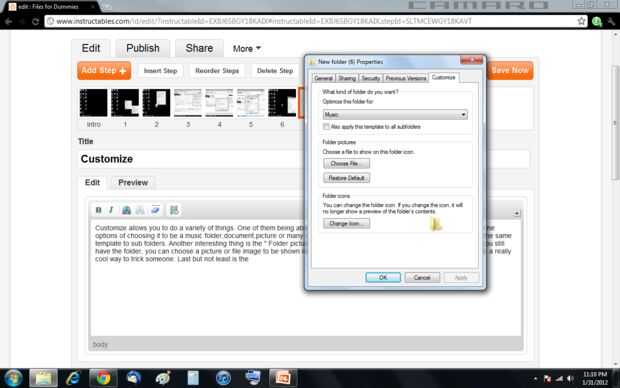 Personalizar le permite hacer una variedad de cosas. Uno de ellos es capaz de elegir qué tipo de carpeta que desea ser. Tienes las opciones de elegirlo que una carpeta de música, documento, imagen o muchas otras cosas. Luego también tienes la opción de agregar la misma plantilla a subcarpetas. Otra cosa interesante es la sección de "Imágenes de la carpeta". Si todavía no han cambiado todavía el icono, y todavía tienes la carpeta, puede seleccionar una imagen o archivo imagen para ser mostrado dentro de la carpeta en el escritorio o donde se encuentra. Su una genial manera de engañar a alguien. Último pero no menos importante es la sección de iconos de carpeta de la ficha personalizar. Esto le permite cambiar el icono de todo desde una carpeta a una imagen diferente. Windows tiene una gran variedad de imágenes. Que haciendo otro instructables entrar más profundo en el tema. Y eso es todo para este instructable. Diviértete construyendo carpeta.