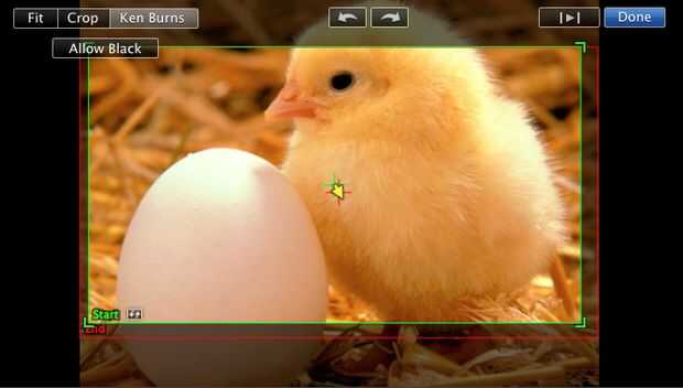 cuando arrastra tus fotos en mi película, tienes que sacar el do de efecto de quemadura ken que no ampliar tus fotos y hay un flujo más consistente de su vídeo. Todo lo que tienes que hacer es haga clic en el botón negro en la parte superior izquierda del clip de imagen y presione el botón de ajuste y haga clic en hecho.