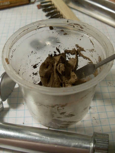 Rociar la superficie con agua destilada y mezclar cuidadosamente. Añadir más spritzes de agua y seguir revolviendo hasta que la mezcla comienza a agruparse. Mezclar bien entre spritzes hasta que la mezcla empieza a sentir como arcilla. Ligeramente las manos con aceite de oliva o bálsamo natural de la mano del aceite y exprimir la mezcla. Si mantiene unida entonces puede amasar a mano. Si la mezcla empieza a desmoronarse, trabajar en un poco más de agua. Si está muy pegajosa, dejarla secar un poco y la reanudación o añadir un poco más metal en polvo o maicena.