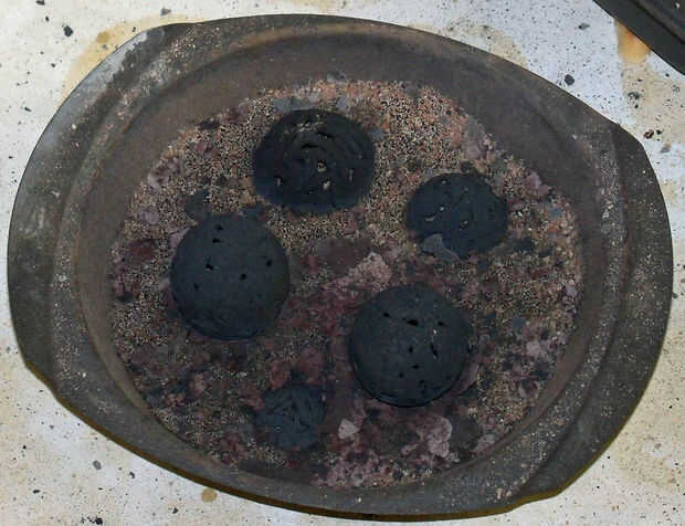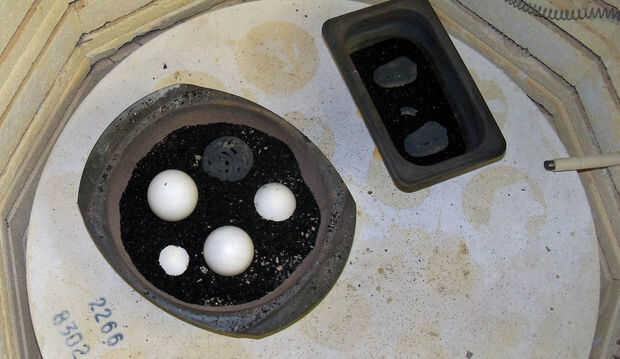 4. el recipiente de cocción con cerca de 1 pulgada de carbón activado de coco de la línea. Tomar la cáscara de huevo, con su filigrana bronce seco adentro y suavemente colocarlo boca abajo en el recipiente de cocción. Esto ayuda a que la arcilla ayuda a sí mismo, formando un arco bóveda dentro de la cáscara de huevo. Disparó mi primer huevo con el lado abierto hacia arriba, como un tazón de fuente, y la filigrana tirado aparte durante la primera cocción. Coloque la cáscara de cada huevo cerca de 1 pulgada de los lados y por lo menos 1/2 pulgada entre ellos. Dejar envase destapado y fijó en zancos o correo en el centro de su horno para proveer buena circulación de aire alrededor de su recipiente para calentar más aún. Comprobar que los lados del recipiente no toque las paredes del horno o punta de la sonda.