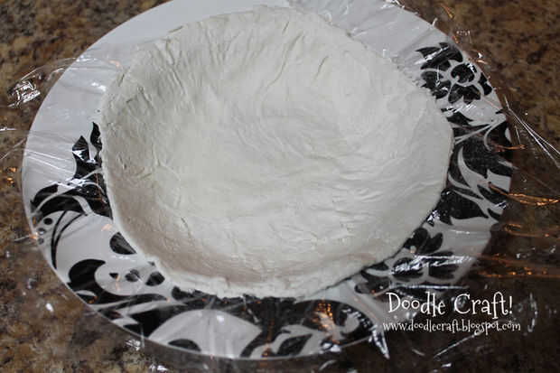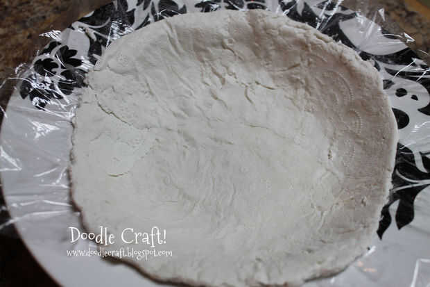 (estirar la arcilla pegajosa... pone una bola en un pedazo de envoltura de plástico,