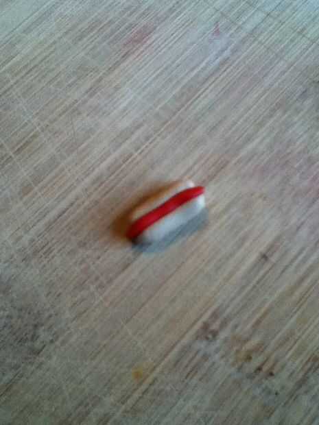 Primer rodillo un cilindro de arcilla tan y cortar hasta el tamaño adecuado. Entonces haz tu q-Tip y presiona en el cilindro para hacer un surco. Luego rodar un cilindro delgado de color rojo y corte hasta el tamaño adecuado. Luego poner "hot dog" en el "bollo" y lo completan. Ya listo el perro caliente!