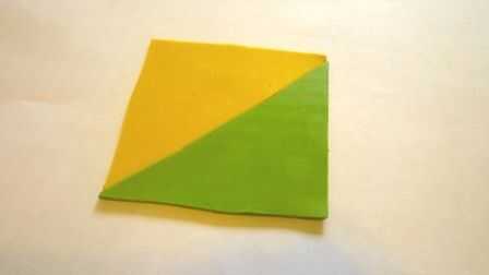 Cortar triángulos de la arcilla y pone un triangulo amarillo y un triángulo verde juntos para que formen un cuadrado. Porque tienes dos triángulos de cada color, podrás hacer dos plazas completos, lo que le permite repetir el tutorial todo una segunda vez, si lo desea.