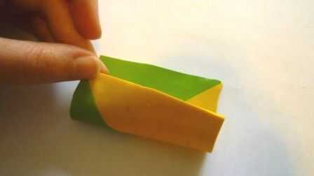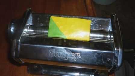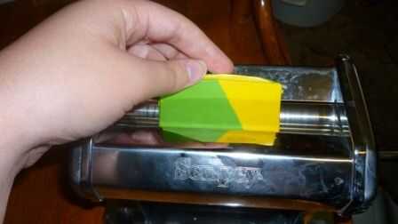 Doblar el cuadrado de fondo a la tapa (como se ve en la primera imagen), con cuidado y suavemente presionando los bordes juntos y asegurándose de que no hay burbujas de aire grandes quedan atrapadas entre las capas. Recorren la arcilla de la máquina (todavía en la posición 3, posiblemente de un tamaño más fino) doblado final primero.