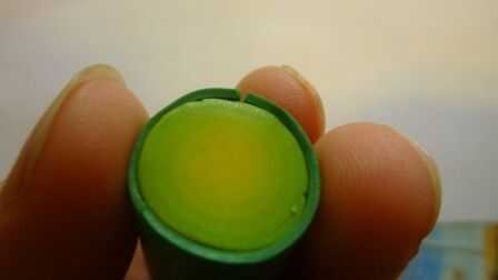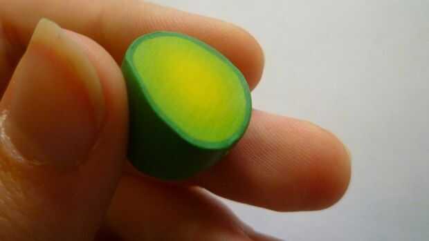 Tome cada rodaja y empuje la arcilla verde oscurezca alrededor de los extremos, cubriendo toda la sección interna de la arcilla. Me gusta dejar un poco de una marca a la nota donde el centro del degradado es que cuando corte el aguacate por la mitad, el gradiente espiral hacia fuera desde el centro, en lugar de allí siendo una franja amarilla en medio aguacate.