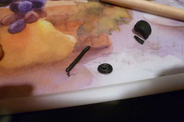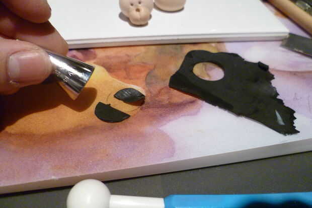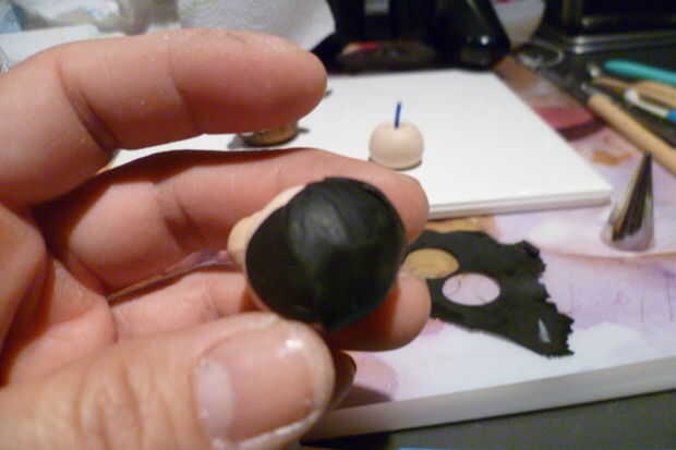 De la bobina un trozo largo de barro negro en un bollo y agregar a ambos lados de la cabeza.
