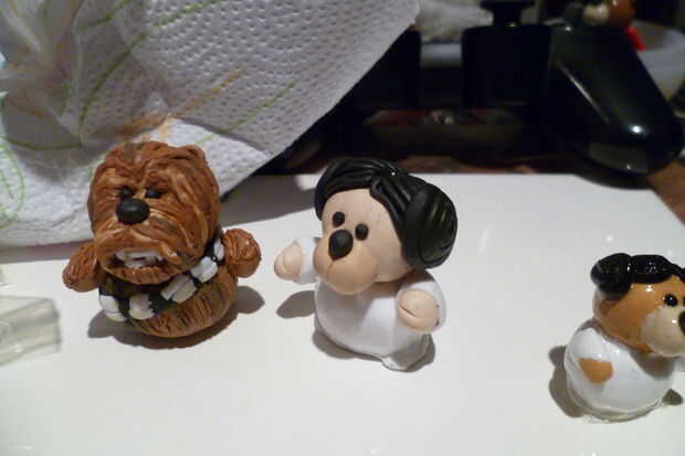 Rodillo de pedazos de salchicha larga de barro negro y agregarlo lateralmente desde el centro de la cabeza (para que el cabello se divide en el centro) encima de los semicírculos. Ver la imagen de la princesa Leia como referencia.
