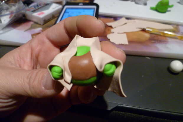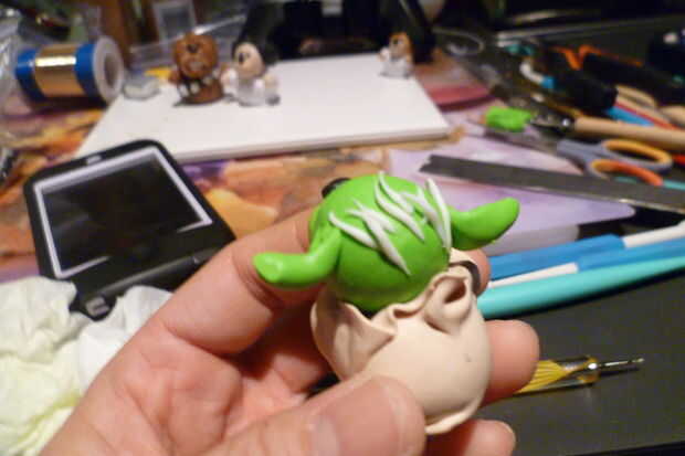 Rodar un cilindro pequeño (con cinta un extremo) con la arcilla verde para crear el oído. Lleve la herramienta cónica y presione longitudinalmente en el oído y rodar un poco para hacer la apertura del oído. Añadir a la cabeza.