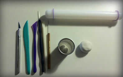 Entonces usted necesita agarrar algunas herramientas para ayudar a condición, aplanar, forma y haga una incisión en la arcilla. Usé un cuchillo X-acto, un cuchillo de plástico verde, algunas herramientas de modelado de arcilla de polímero básico y un instrumento puntiagudo.