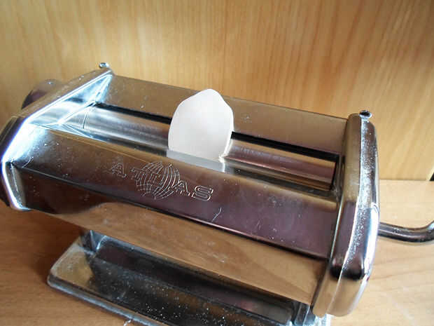 Pasar a través de la máquina de pasta uno en un tiempo a partir del tamaño más grueso y pasar a través de los otros tamaños diferentes hasta llegar a aquel que hace la arcilla alrededor de 1, 5mm de grosor (0,05 pulgadas).
