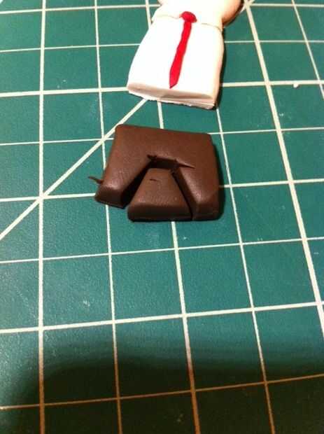 Así que lo que normalmente hago (porque soy muy vago), es justo hacer un rectángulo con mi arcilla marrón oscuro, asegurándose de que sus aproximadamente a la altura de la camisa. Entonces yo cortar un triángulo plana y la parte superior del rectángulo. No te preocupes si los cortes no están el más bonito, sólo alisa los bordes y alrededor de ellos un poco. Una vez que eres feliz con tus pantalones, puede presione en el cuerpo, sólo tenga cuidado de no les mush. En este punto, usted puede Agregar los detalles en los pantalones si quieres, yo sólo uso mi cuchillo xacto para cortar líneas muy pequeñas, no en absoluto en la arcilla, hacer las bolsas y así sucesivamente.