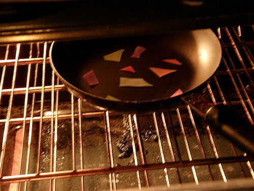 Encogimiento del plástico según las especificaciones del fabricante. Asegúrese de que el plástico es totalmente hecho encogerse antes de sacarlo del horno. Si el plástico no es reducido completamente puede encoger más cuando usted hornee la segunda vez con la arcilla que darán lugar a las lagunas.