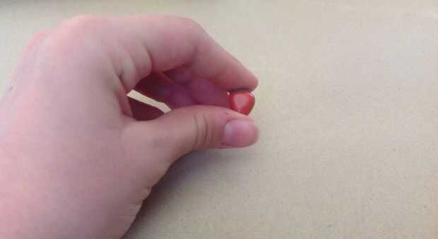 Tener una bola de arcilla roja y forma en una lágrima Coloque algunos pedazos de arcilla verde en la parte más gruesa Pintar un rostro con la herramienta de balling y pintura Cueza al horno y esmalte