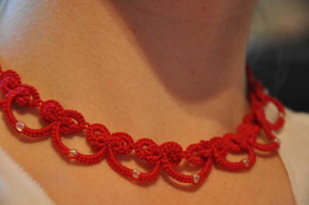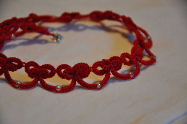 Aprendí encaje de aguja de TotusMel y esto es solamente mi segunda pieza original. He utilizado las perlas para que la proa se vería más separada entre sí. He pensado realmente haciendo los arcos separados y podría tratar de en algún momento. Sólo tomará más tiempo hacerlo.