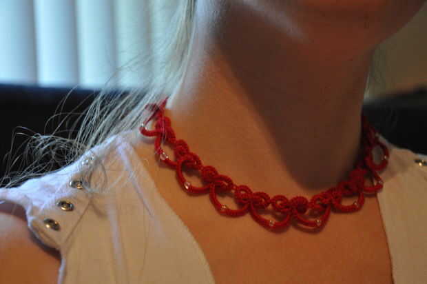 Este collar fue aguja soy usando hilo crochet rojo y perlas iridiscentes regulares y un cierre de garra de langosta.