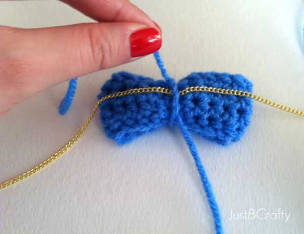 Ahora, se voltea el arco para la parte trasera quede hacia arriba. Línea de la media de la cadena con el centro del arco y usan la cola para anudar en el lugar.
