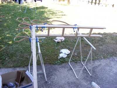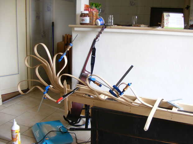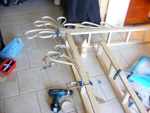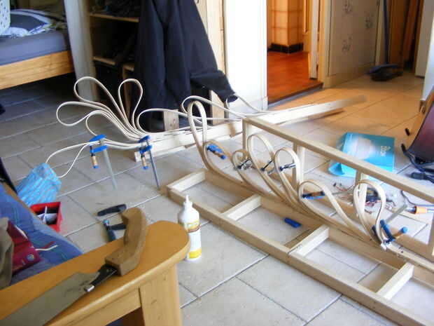 Las volutas son atornilladas y al aire libre pegado al marco. Primero les hizo y coloqué todo con pinzas, para definir su posición final y entonces fijado todo el asunto.