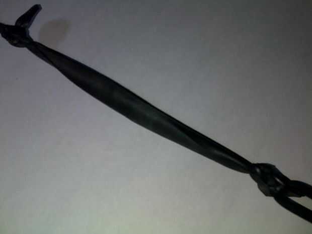 Tomar el tubo interno viejo y cortar una tira de ocho pulgadas de largo y una pulgada de ancho atan entre sus dos bandas - un poco como cuando se configura el caucho en una catapulta.