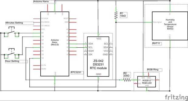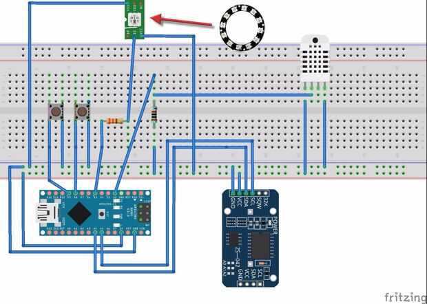 Hay varias bibliotecas para DS3231 por ahí, así que estoy ofreciendo aquí que utilizo. También nota que usted puede encontrar una versión de DHT11 ya incluye R1 (generalmente se sienta en un pequeño tablero y no es un componente crudo). En este caso omitir R1.