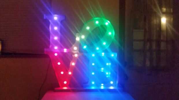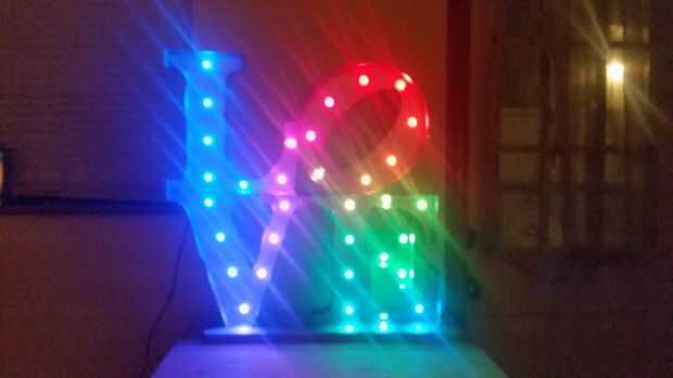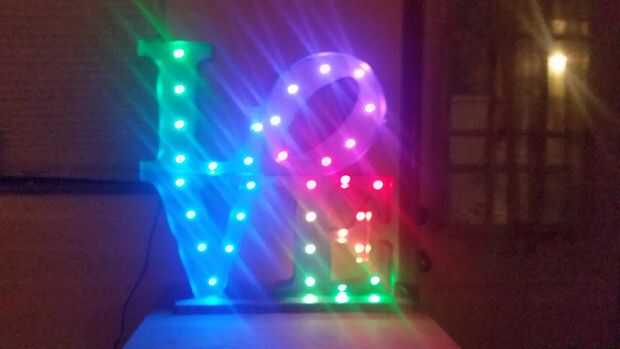 Me voy a casar a finales de mes y quería hacer algo eléctrico y mágico para mi gal para una pieza central de la tabla. Ya que estamos casados a sólo cuadras del parque de Filadelfia"amor" que decidí tomar la icónica estatua y transformar en letras Marquesina con pixel LED controlado por un Arduino. Biblioteca de Neopixel de Adafruit me permitió agregar un patrón de iluminación de arco iris que se ve realmente maravilloso.