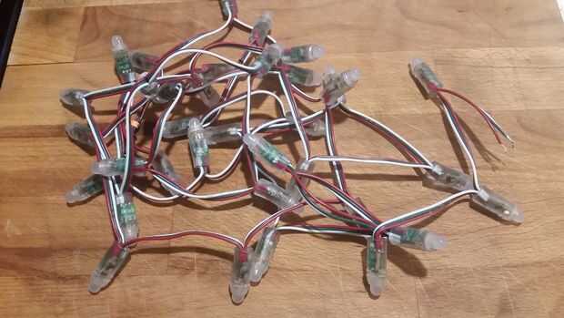 Los píxeles deben ajustarse perfectamente en los orificios de 1/2" por lo que no necesita ningún pegamento. Ser conscientes de la dirección de los cables como se indica en los píxeles. Hay una pequeña flecha indica "Entrada" y la "Salida." El nano de alambre al pin 3 para los datos y la alimentación a 5V y tierra a tierra. El botón fue colocado en el pin 6, pero se puede colocar en cualquier pin, por favor. Un lado del interruptor va al pin el otro a tierra. Usé un interruptor estilo para encender y apagar la pantalla de mi. Esto depende de cómo desea para su pantalla. Usted podría utilizar un transformador usb con un micro final para el nano. Luego para apagarlo, simplemente desconecte. Si utiliza la batería, a poner el interruptor.