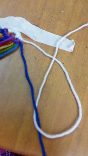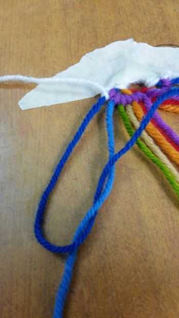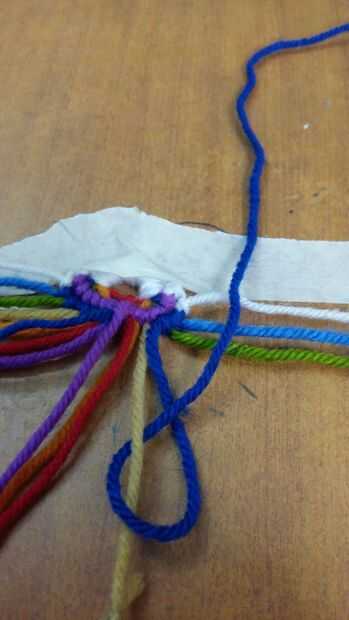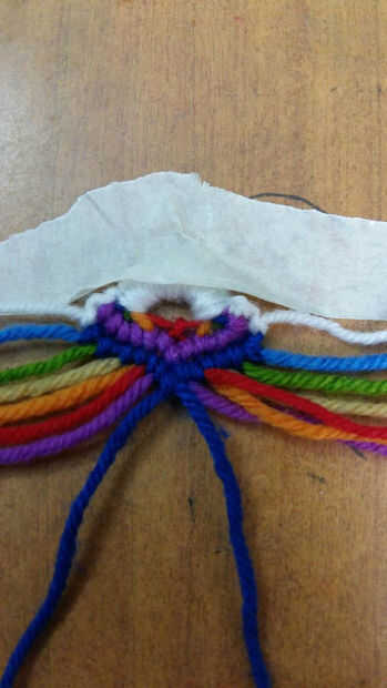 • Luego proceder a lado derecho... b-nudo y f-nudo con el blanco del hilo de rosca entonces dobles b-nudos con el hilo añil hasta llegar al centro