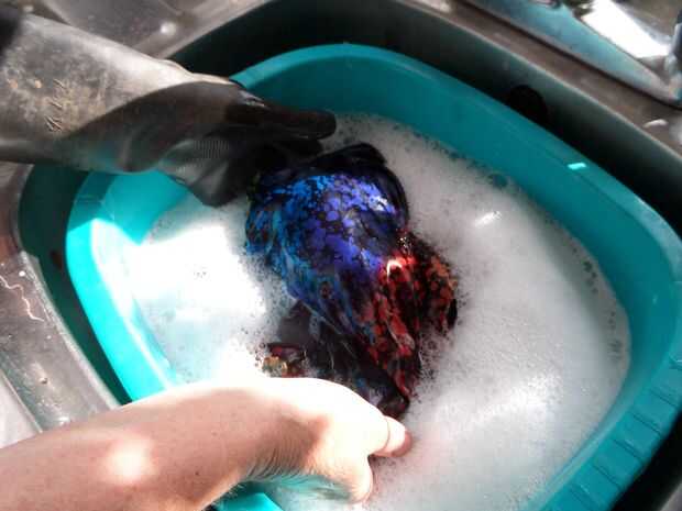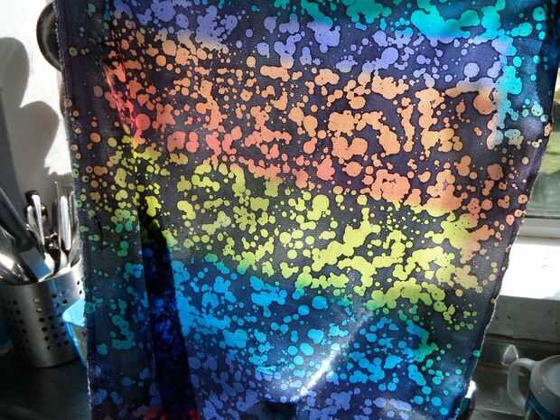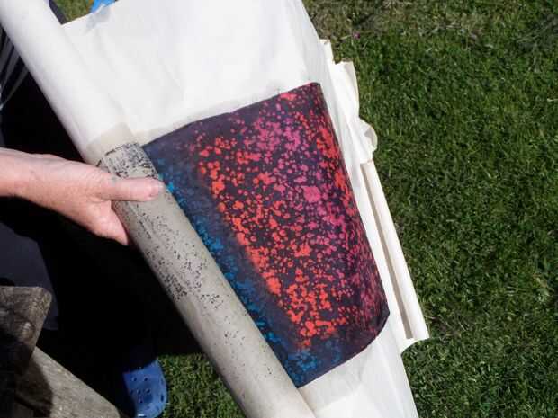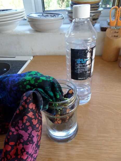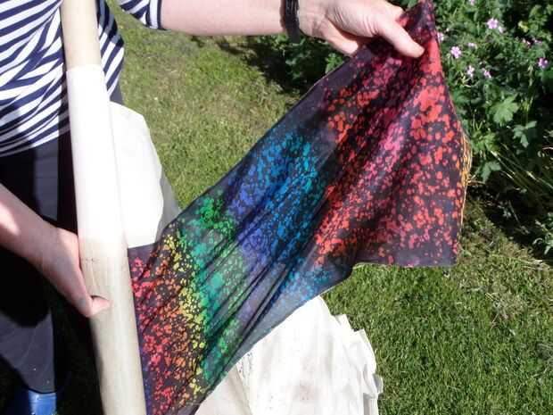 Unrol el papel de forro para revelar la seda, la mayoría de la cera ha sido al vapor hacia fuera, pero para quitar el resto Utilice aguarrás en un tarro. Coloque la seda todo esto y agite por unos minutos. Después de que remoje en agua tibia jabonosa y terminar añadiendo suavizante suave para hacer el seda olor fresco!