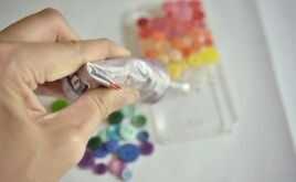Cuando su feliz con su diseño, puede empezar a tomar de unos pocos a la vez y pegar hacia abajo en su disposición original. Repita hasta que todos los botones se pegan abajo.
