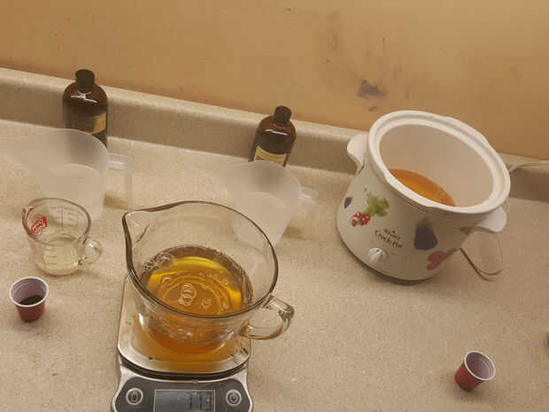 Usé mi receta estándar que limpia muy bien y tiene colores y fragancias. Es sebo de carne de vacuno 70% que hacen de la grasa proporcionada por un carnicero local. Sebo hace que la barra sea difícil y es un eficaz limpiador. A eso añadir el aceite de coco 20%. Esto da el jabón espuma agradable. Las burbujas son divertidos, pero también brindan una eficaz técnica para levantar los aceites de la piel, limpieza de tal modo. La final grasa es manteca de karité. Manteca de karité es buena porque algunos de los permanece después de que el jabón se hace y proporciona un efecto hidratante. Mi receta es: