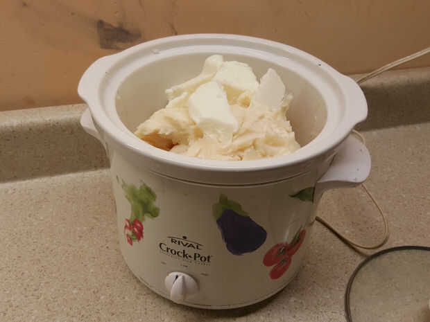 La receta es para 17" pan. En primer lugar, medir las grasas y calentar para arriba. Utilizar una olla grande.