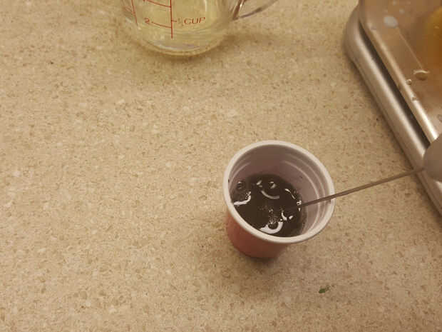 A dividir los aceites en dos partes iguales antes de añadir estas cosas. Puesto que los dos colores se vierte en diferentes momentos, tendremos que medir dos conjuntos de lejía. He premezclado lejía/destilada agua en un recipiente grande para facilitar las cosas. La mezcla de lejía y agua para esto es: