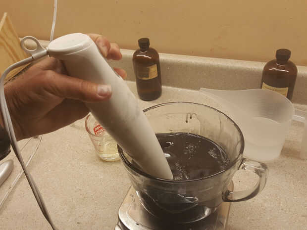 Una vez que los aceites se calientan, vierta la mitad (775g) en una jarra colable. Añadir primero el color y la mezcla con una batidora de palo. A continuación añadir la lejía. Una vez en un rastro ligero, agregar la fragancia. Usted debe trabajar rápidamente, como algunas fragancias la masa bastante rápidamente.