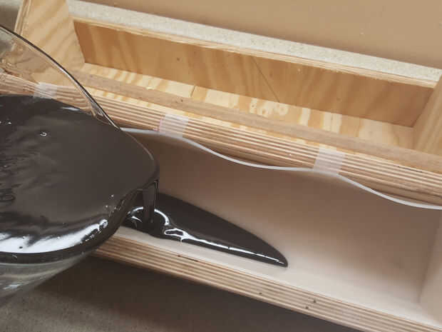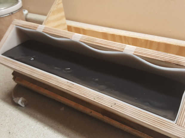 Asumir la emulsión a la plantilla donde el molde está a la espera. Viértala con cuidado, asegurándose de que se distribuye uniformemente de derecha a izquierda. Tenga cuidado de no salpicar la pared posterior o acabarás con una mancha negra en uno de sus bares.