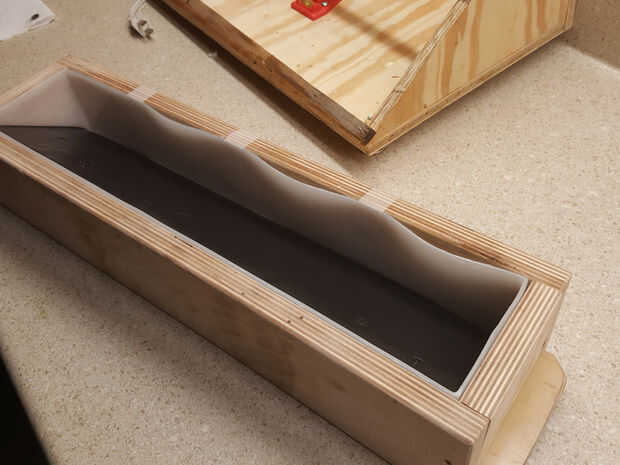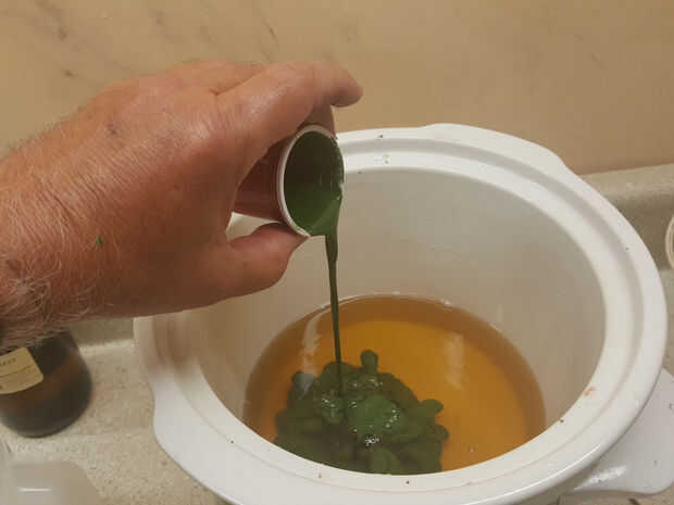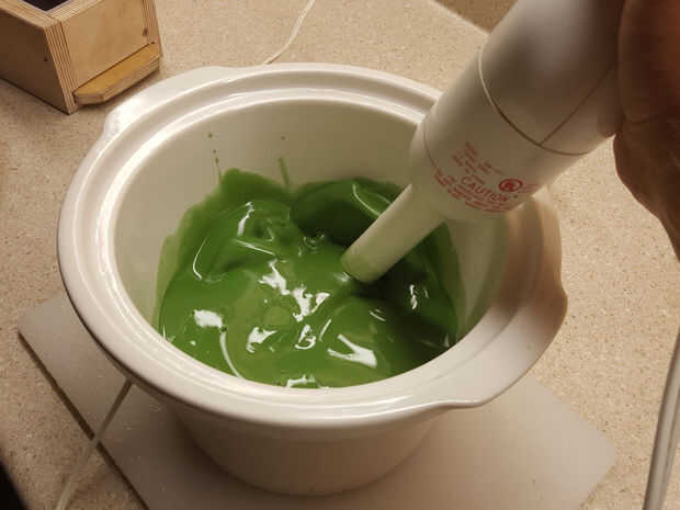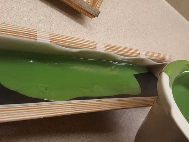 Vierta con cuidado el color desde un ángulo bajo, teniendo cuidado de no molestar a los negros. Este es probablemente el paso más crítico. Si usted vierte demasiado agresivamente, o si el negro no ha definido lo suficiente, usted conseguirá una línea irregular. Si el negro ha puesto encima de demasiado, la barra se dividirá diagonalmente después es cortada y curada.