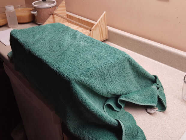 Después de la segunda vierta, cubrir el pan con una caja y una toalla y déjalo durante al menos 24 horas. Esto le dará los productos químicos tiempo suficiente para reaccionar y crear un jabón suave.