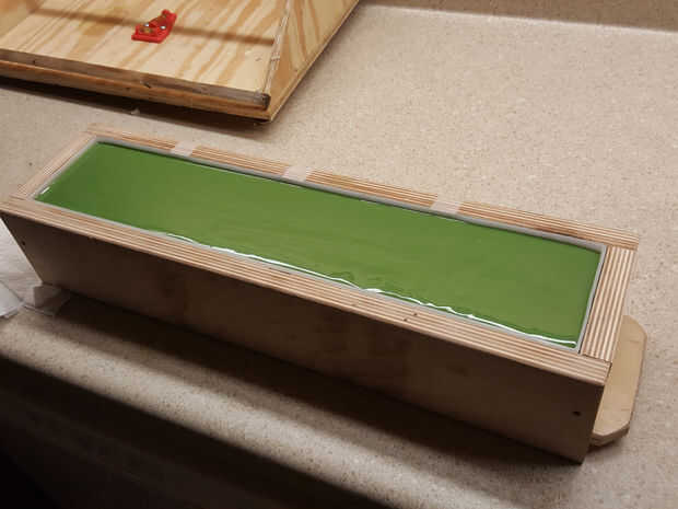 Cuando el negro es firme al tacto, es hora de empezar el color. Seguirás el mismo proceso de la mezcla del color y luego agregando lejía y fragancia. Ahora bien, excepto cuando usted vierte, le quite el pan de la plantilla angular y ponerlo sobre una superficie plana.