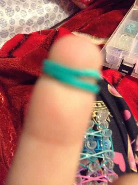 Ahora es el momento para agregar una banda de la tapa! Hacer una figura de 8 con una banda de goma (yo prefiero negro o del mismo color de la venda como las gomas colocándola en) cualquier color que desee y poner la figura 8 para hacer una O que ha sido duplicado