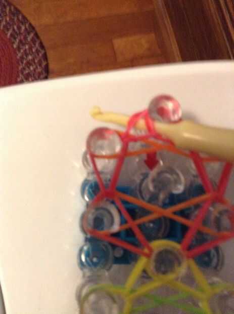 Ahora tomar una banda elástica, cualquier color y ponga el gancho a través del agujero superior. Cuando el gancho está en, colocar la goma y tire su anzuelo detrás del orificio con la goma mitad fuera y mitad en el agujero