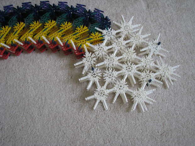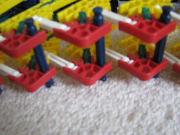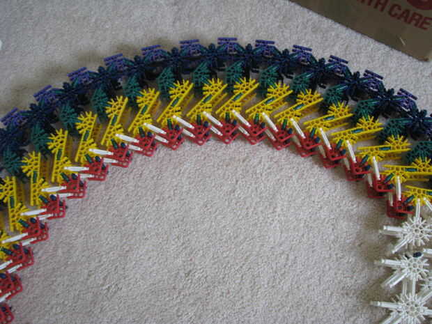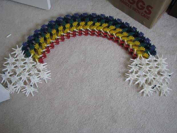 esto es un arco iris doble que hice de K'nex. No tiene ninguna naranja sobre ella porque no tengo cualquier Conectores fichas naranja. Pero todavía creo que esto se ve bien. Usted puede cambiar los conectores amarillo con conectores fichas naranja en la segunda fila de la parte inferior de salida. La cosa entera es realmente dos idéntico plano arco iris capas junto con barras azules. Buena suerte y Diviértete construyendo :)