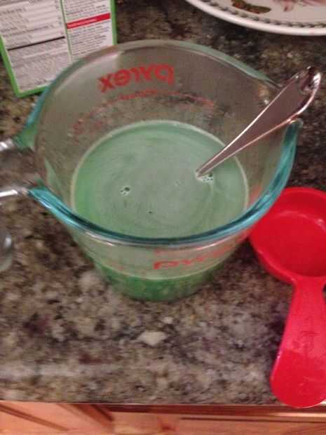 Después de otras 1,5 horas mezclar la gelatina verde y verter encima el resto. Dividir uniformemente las capas.