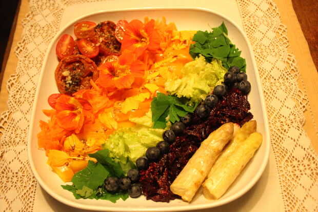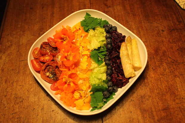 La paleta de arco iris de este plato lleva en sus colores, pigmentos naturales, estos tienen propiedades antioxidantes potentes y entre los que destacan; licopeno, antocianinas, luteína, betacaroteno, alicina... No sólo tienen propiedades regenerativas y curativas pero puede ayudar a proteger contra la contaminación y las toxinas que causan tanto física y daño al sistema nervioso como la enfermedad. Otra razón para tener un plato vibrante colorido - para como dice el refrán va, primero comemos con los ojos... así que comer el arco iris!