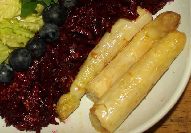 Remolacha cruda, pelada y rallada y mezclada con vinagreta de mostaza. Remolacha más jóvenes frecuentemente se come crudas y las hojas se pueden comer cuando son jóvenes también. Si sólo tiene remolacha más grande podría atemperar el gusto algo terrenal mediante la adición de una cantidad adicional de mostaza.