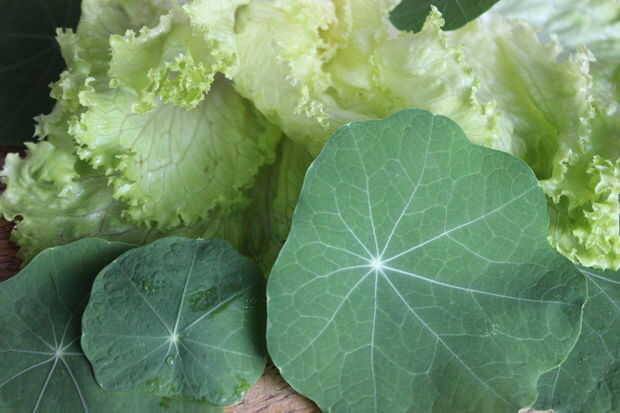 Se trataba de una simple ensalada verde de dos hojas, una lechuga tipo que era muy fresco y grueso y la hoja verde oscurezca fineza delicada de la capuchina. Otra vez usé la vinagreta simple.