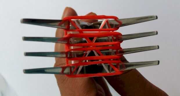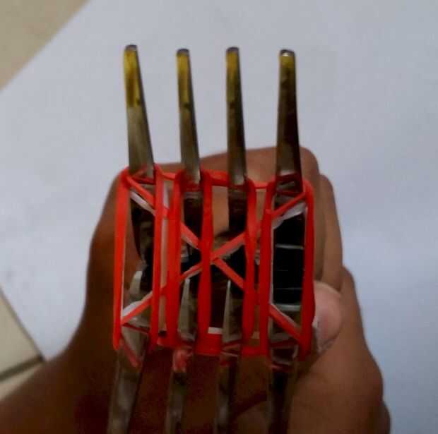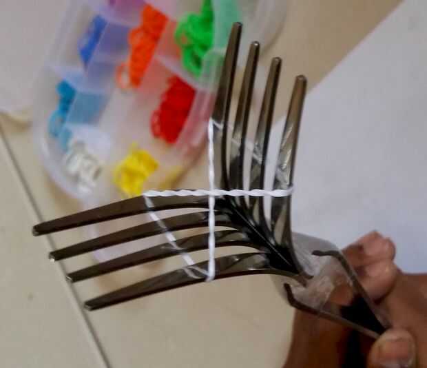 • Ahora toma 4 más bandas rojos y gancho en cada una de las cuatro puntas de la horquilla
