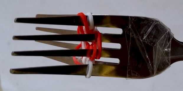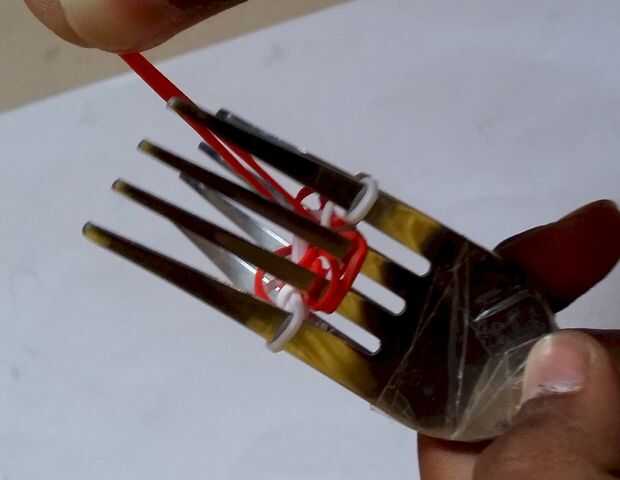 Paso 1: Se necesita:Un telar del arco irisAlgunas gomas de telar del arco irisUn gancho dePaso 2: Colocar las bandas Gire el telar para que la flecha es hacia usted y coloque las bandas (ver imagen)Paso 3: Ahora gire el telar para que la flecha es ha